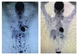 I then visited the church myself and found the purest outpouring of God’s love. Many notable miracles have erupted there. I want you to see documented proof from Loraine Barge, a woman who had 50 cancerous lesions—stage 4 cancer. Look at the PET-scan before she was water baptized at the church. Then look at the PET-scan one day after her baptism. The large black marks are normal body organs, but the smaller black marks in the rst scan are cancerous lesions. All the lesions disappeared! Although she had started chemo, the doctor said at absolute best it would take 4-5 years just to shrink the lesions a little. Her physician assistant said, “It was a miracle”!