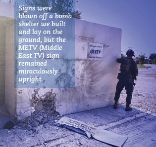 During the first 72 hours of the Hamas–Israel war that violently erupted on October 7, 2023, there was a fierce battle. We strategically placed our bomb shelters in the places that had the most need. One of our shelters was placed at Kibbutz Be’eri. This kibbutz suffered great losses of life; many were kidnapped and held hostage. Our signs were blown off in the battle and lay on the ground, but the METV (Middle East TV) sign remained miraculously upright.